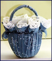 16. Sew a gathering stitch 3/4" down from the edge of the cover with the DMC embroidery floss. Pull tightly to gather and then knot to secure. The gathering should be slightly over the rim of the basket as shown in the picture below.